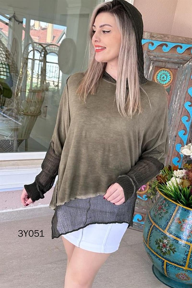 Asimetrik Kesim Kapşonu Fileli Bluz