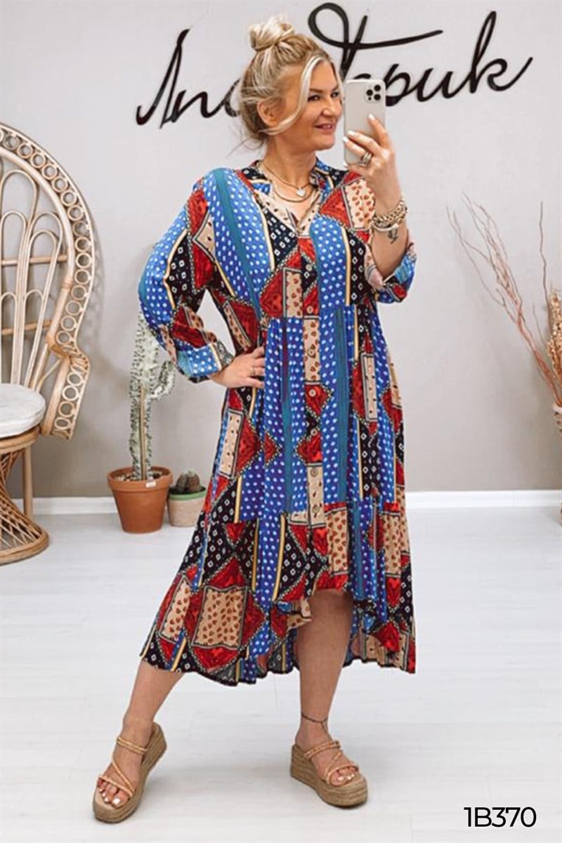 ASİMETRİK KESİM ÖNDEN DÜĞMELİ ELBİSE OMUZDAN AŞAĞI ÖN 100 CM ARKA 115 CM