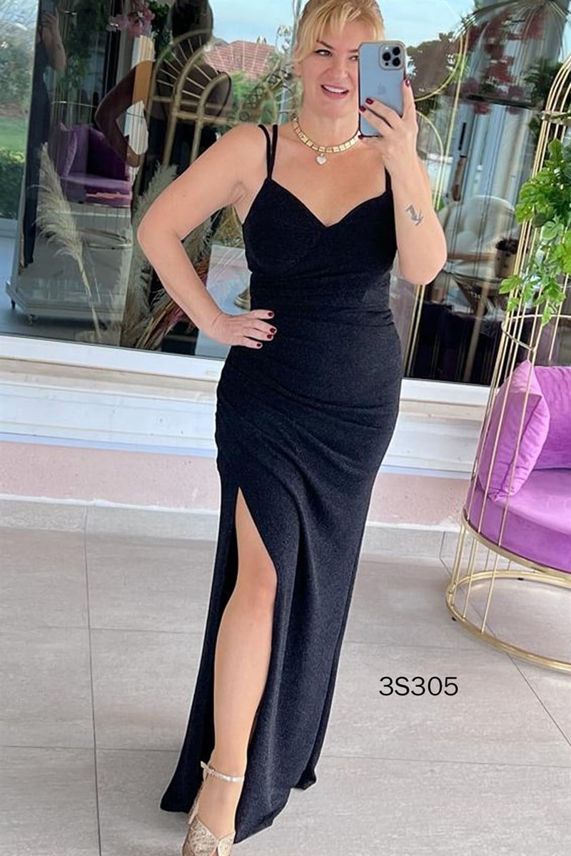 Askılı Pileli Yırtmaçlı Simli Uzun Elbise