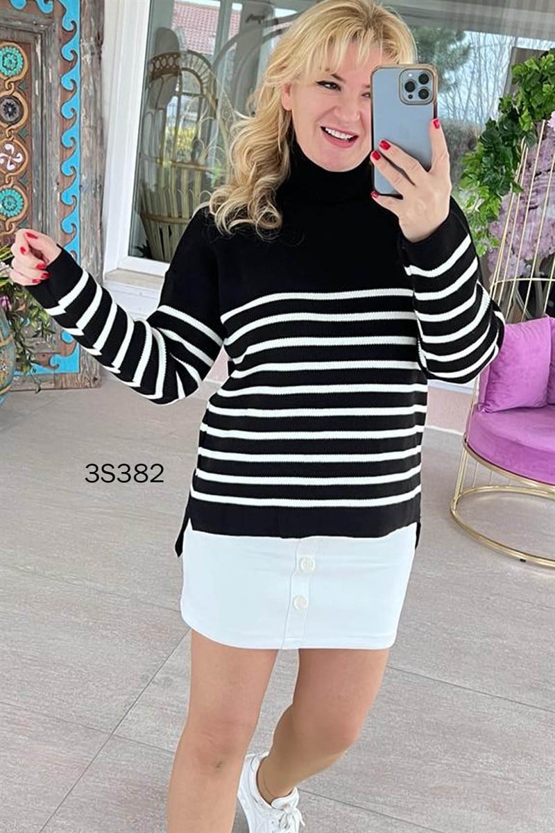 BALİKÇI YAKA ÇİZGİLİ TRİKO BLUZ OMUZDAN AŞAĞI ÖN 59 CM ARKA 67 CM