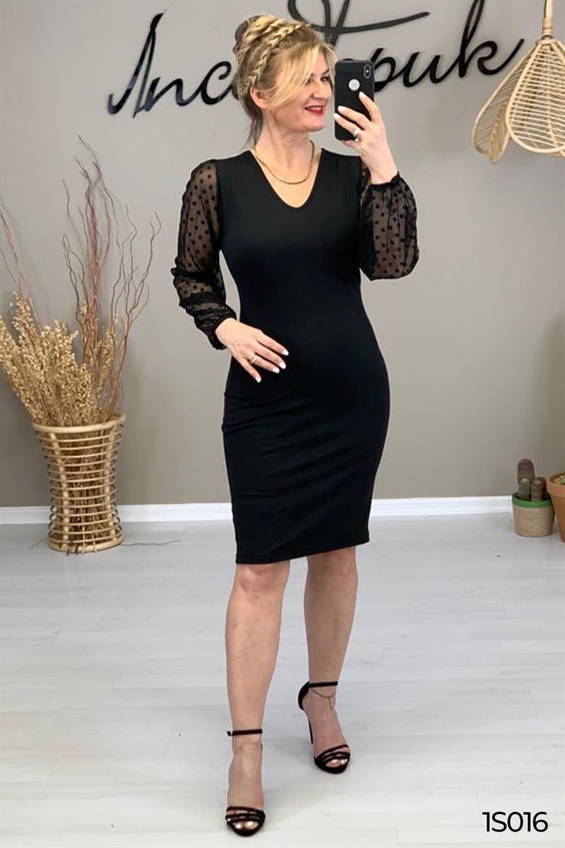 BALON KOL PUANTİYE DETAYLI V YAKA UZUN KOL ELBİSE