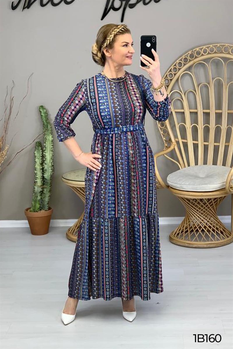 BELDEN BAĞLAMALI DESENLİ ELBİSE OMUZDAN AŞAĞI 135 CM