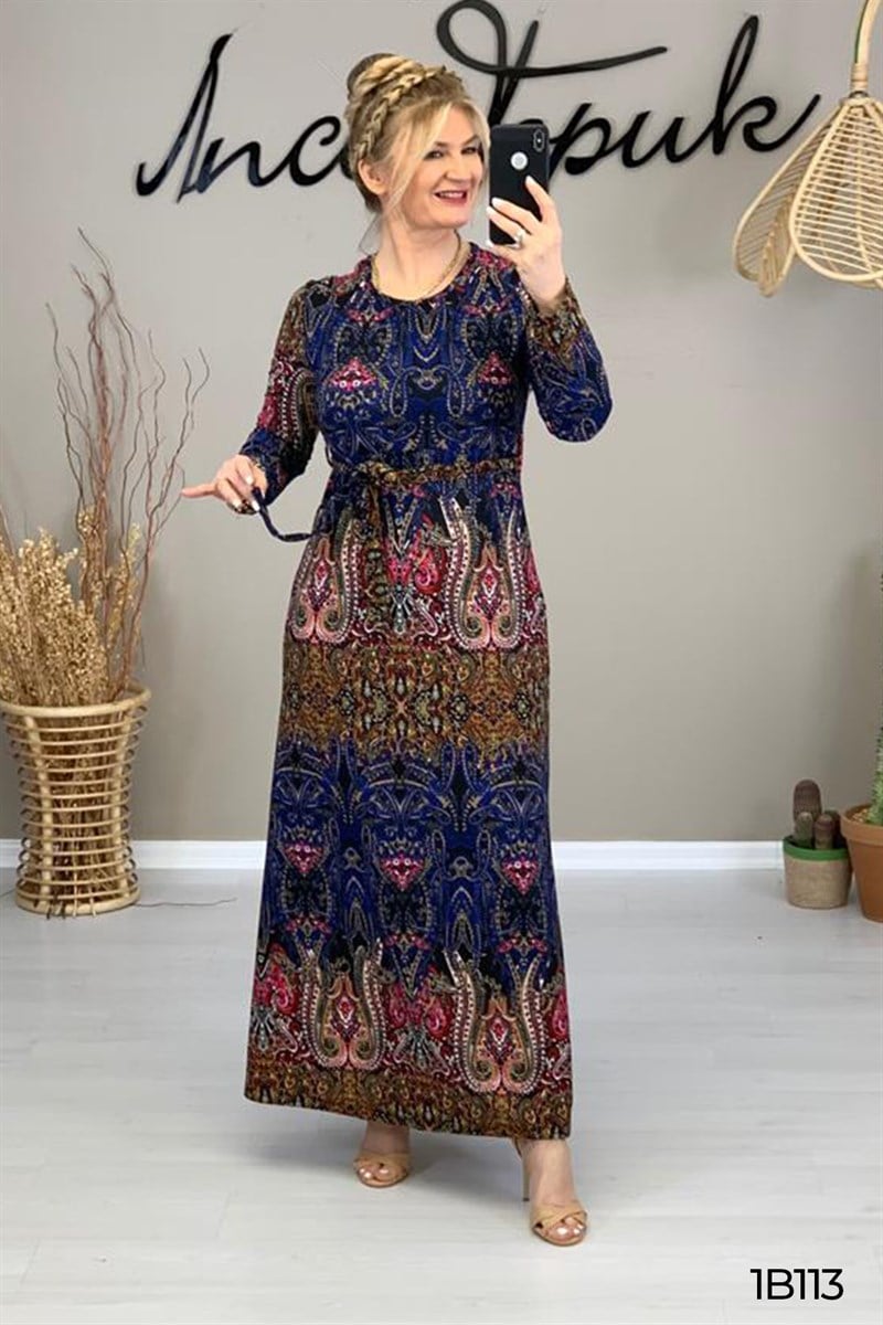 BELDEN BAĞLAMALI DESENLİ ELBİSE OMUZDAN AŞAĞI 135 CM