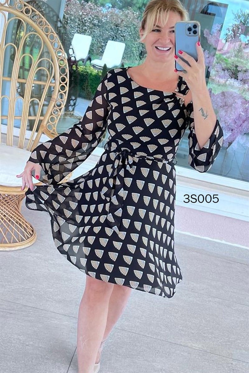 Belden Bağlamalı Omuz Dekolte Şifon Elbise