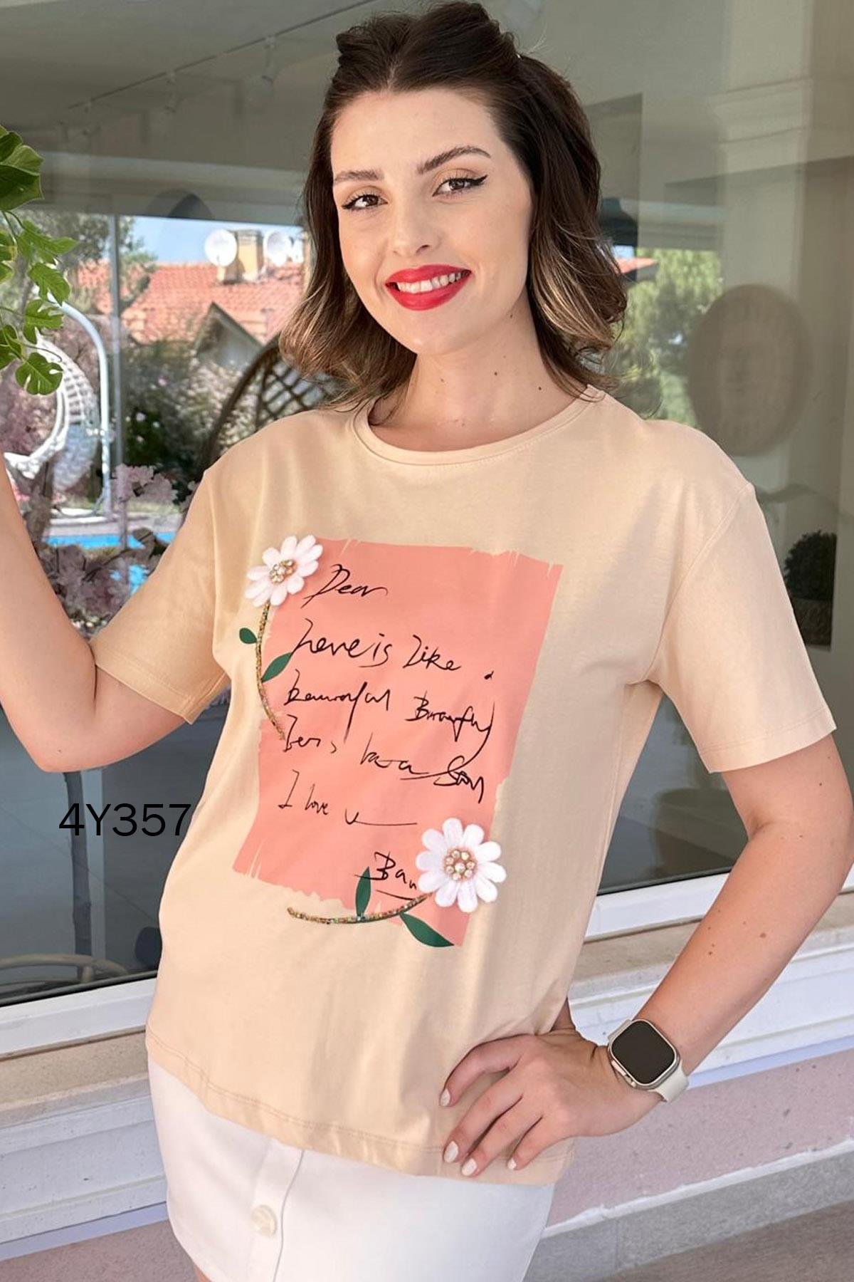 BİSİKLET YAKA PAPATYALI TSHİRT OMUZDAN AŞAĞI 66 CM %100 PAMUK