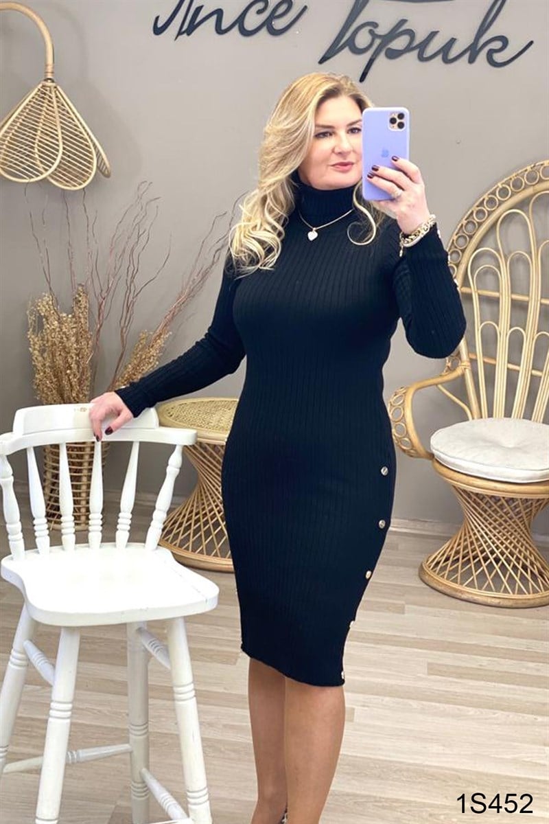 BOĞAZLI DÜGME DETAY TRİKO ELBİSE OMUZDAN AŞAĞI 110 CM