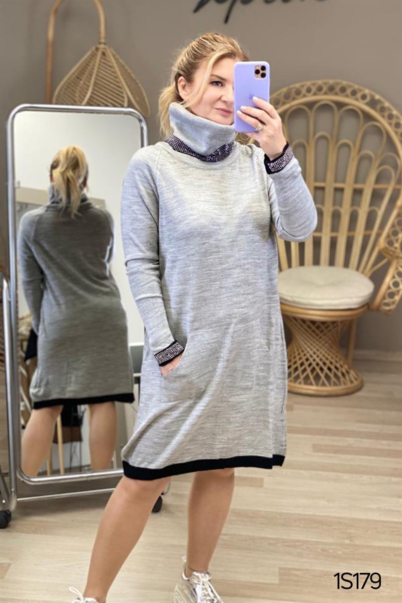 BOĞAZI TAŞ DETAY YANDAN CEPLİ TRİKO ELBİSE OMUZDAN AŞAĞI 95CM