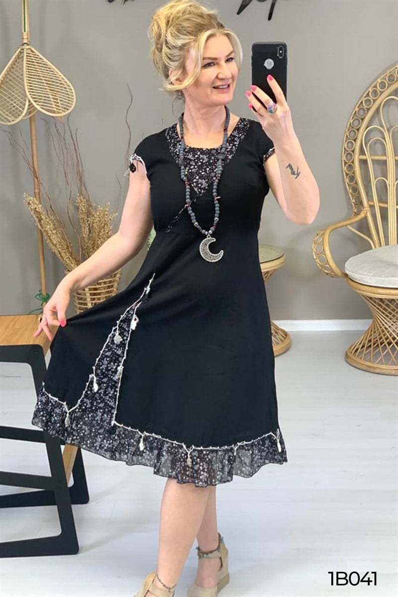 ÇİÇEK DESENLİ GÜPÜR DETAY ELBİSE OMUZDAN AŞAĞI 105 CM