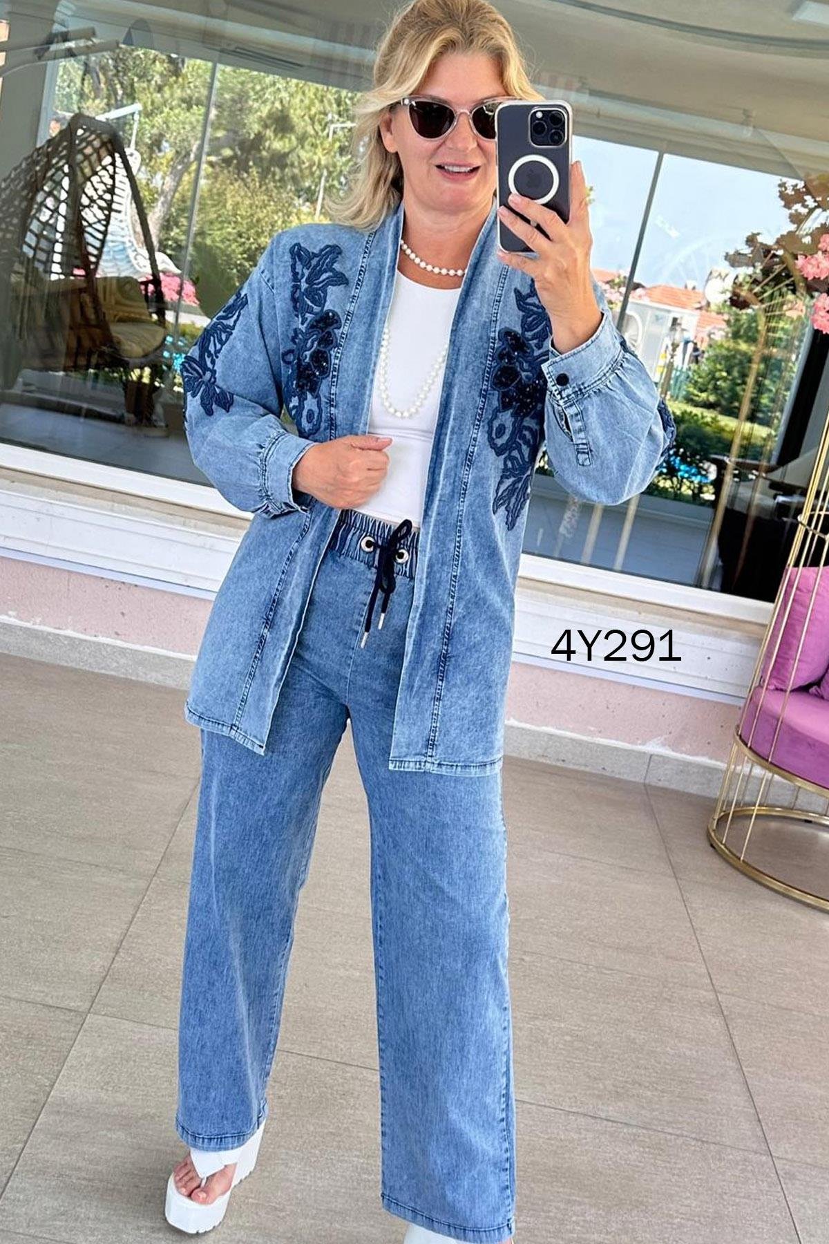 ÇİÇEK NAKIŞLI TENSEL KOT TAKIM OMUZDAN AŞAĞI ÜST 75 CM ALT BELDEN AŞAĞI 102 CM