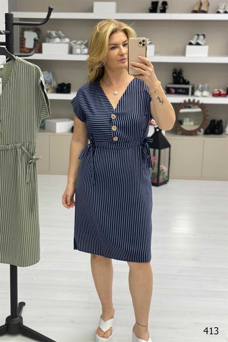 V YAKA YAKA FERMUARLI BELİ BAĞLAMALI KISA KOL ENİNE ÇİZGİLİ ELBİSE.