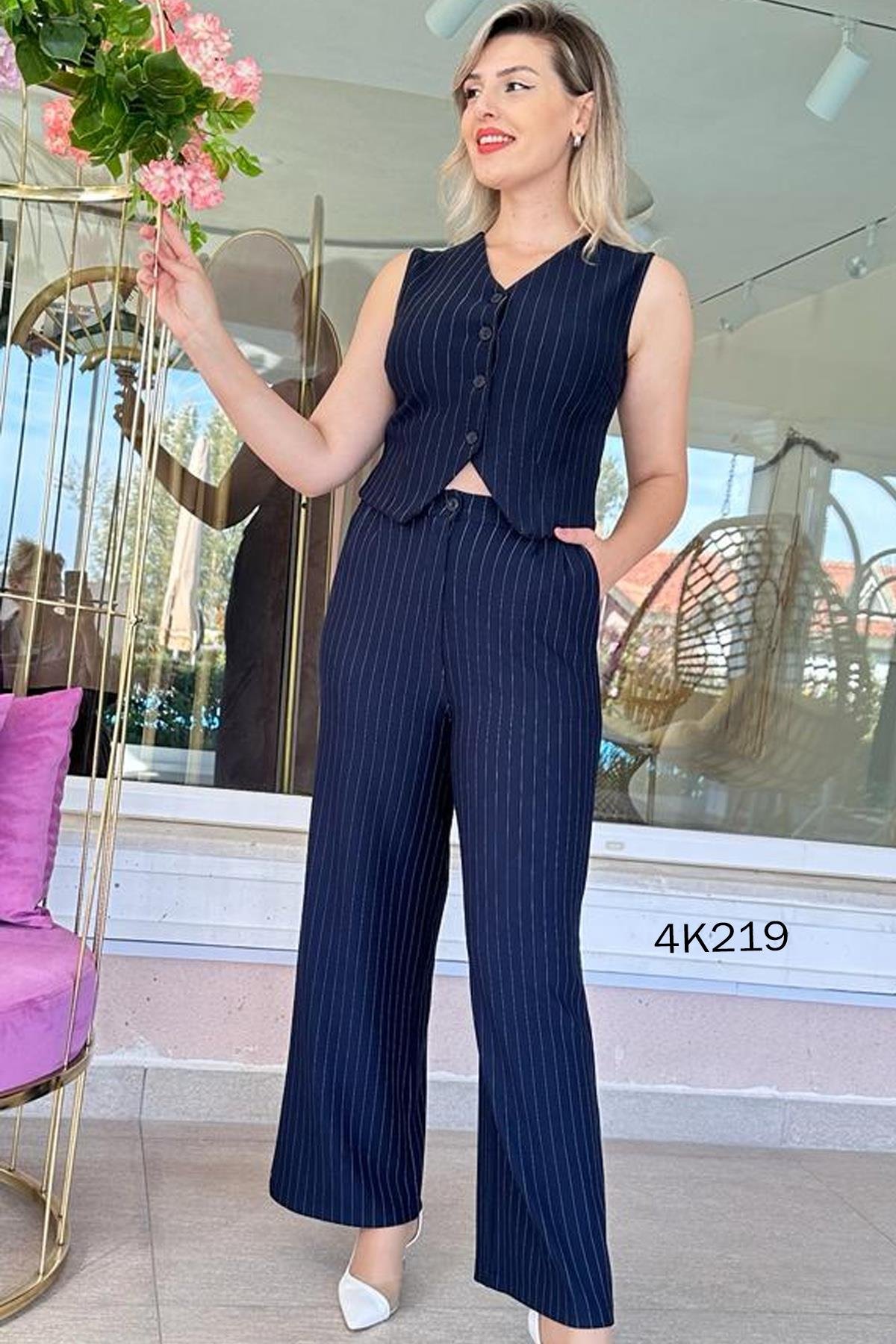 ÇİZGİLİ KREP KUMAŞ YELEKLİ TAKIM OMUZDAN AŞAĞI ÜST YELEK ÖN 50 CM ARKA 43 CM PANTOLON BELDEN AŞAĞI 103 CM