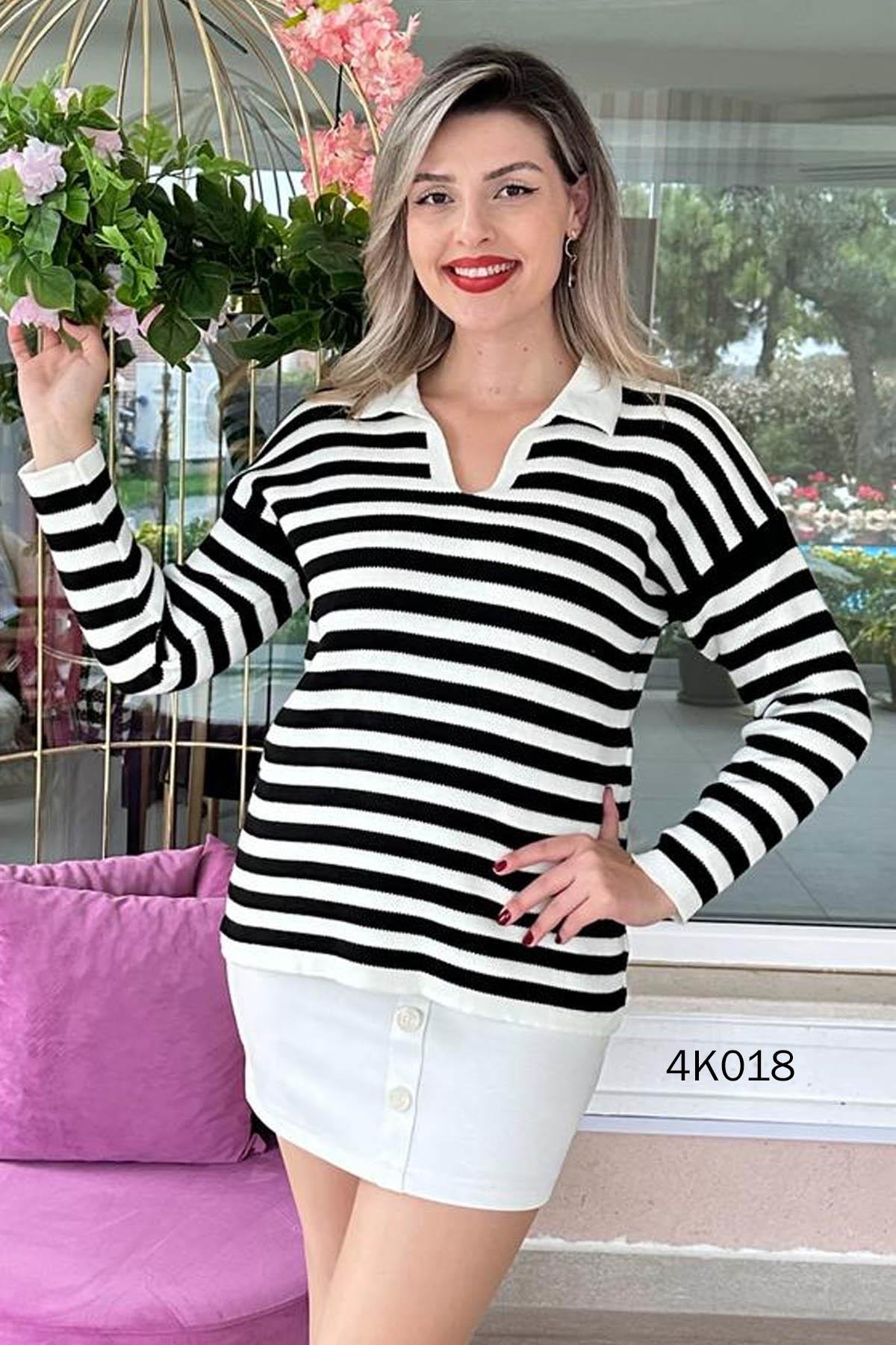 ÇİZGİLİ POLO YAKA TRİKO BLUZ OMUZDAN AŞAĞI 64 CM