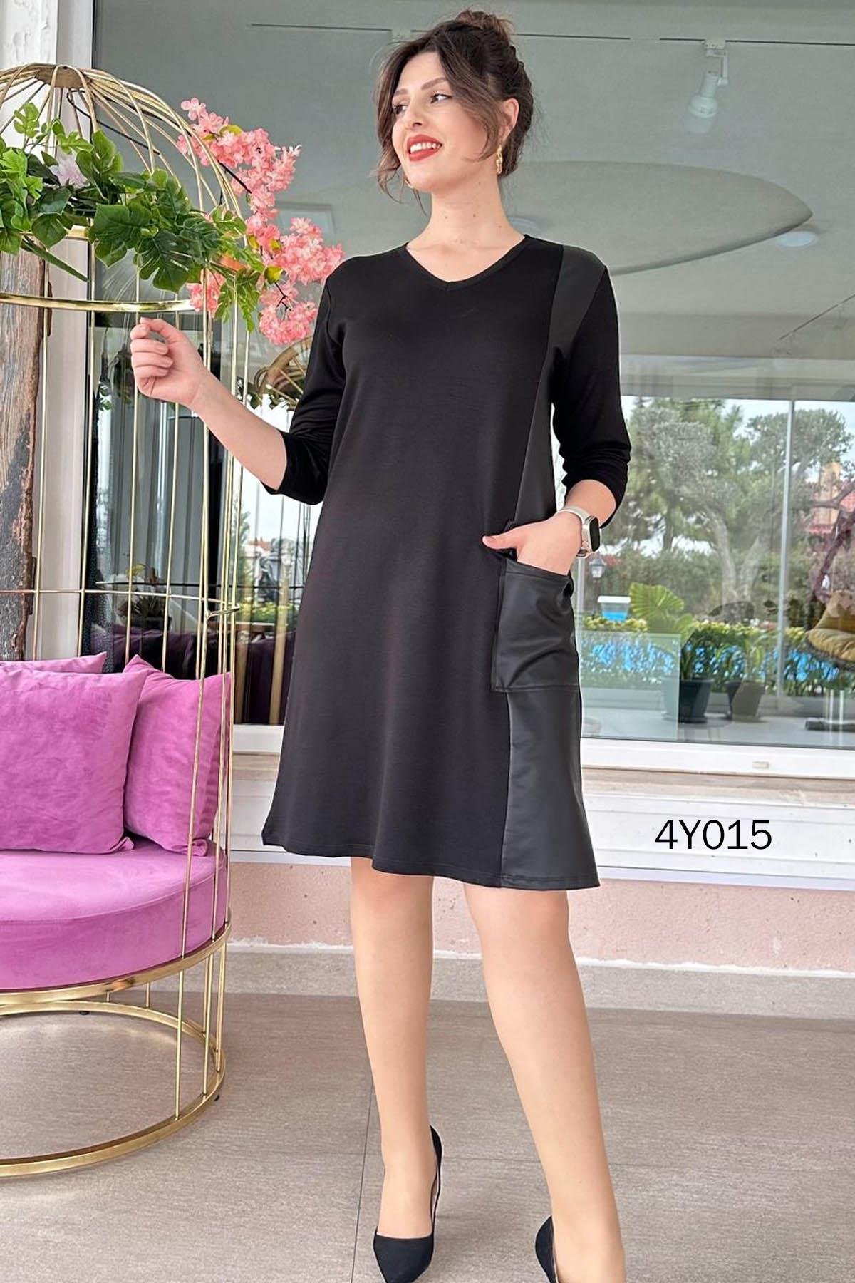 DERİ DETAY VİSKON 2 İPLİK ELBİSE OMUZDAN AŞAĞI 97 CM