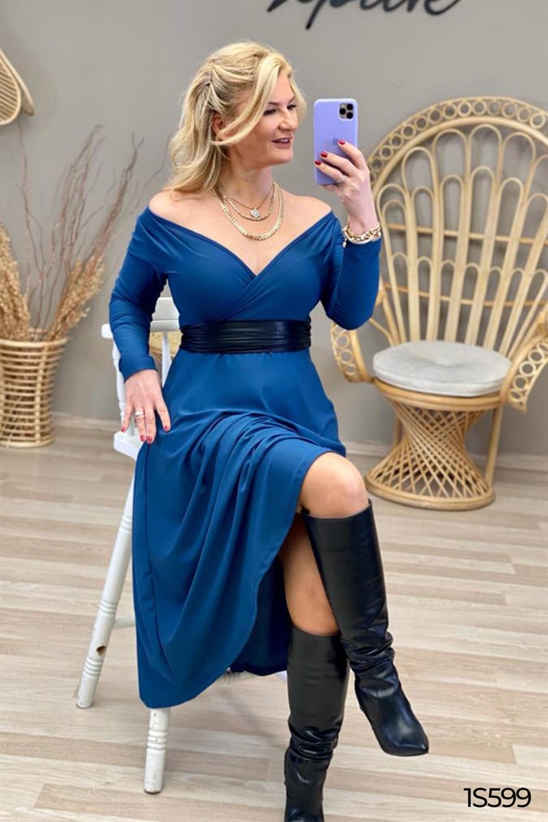 Deri Kemerli Kruvaze Elbise