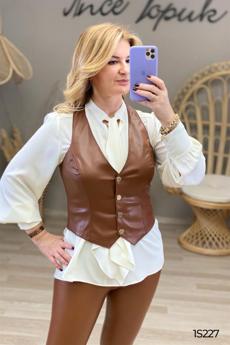 METAL DÜĞMELİ DERİ YELEK OMUZDAN AŞAĞI 52CM