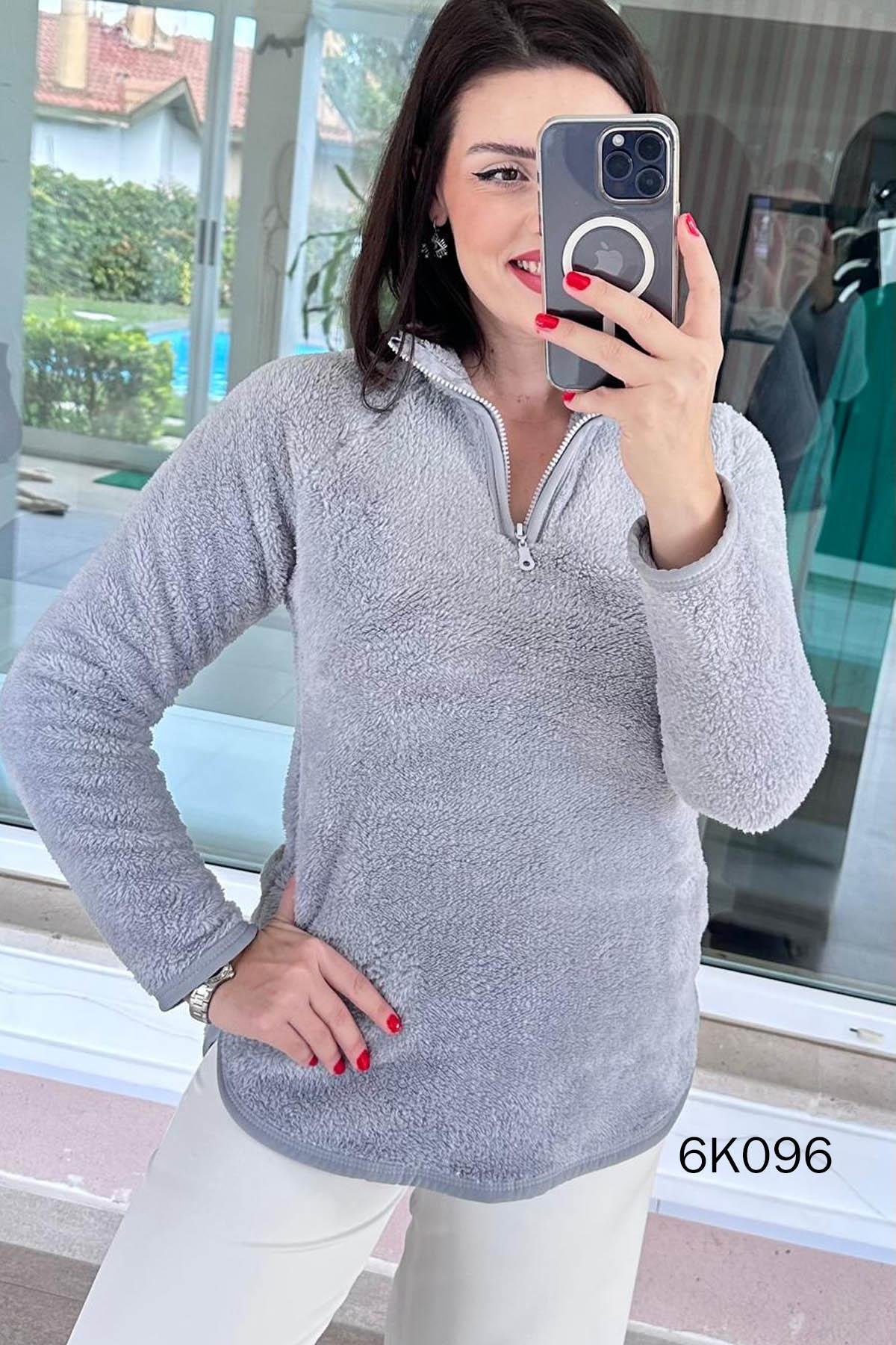 Dik Yaka Yarım Fermuarlı Peluş Sweat
