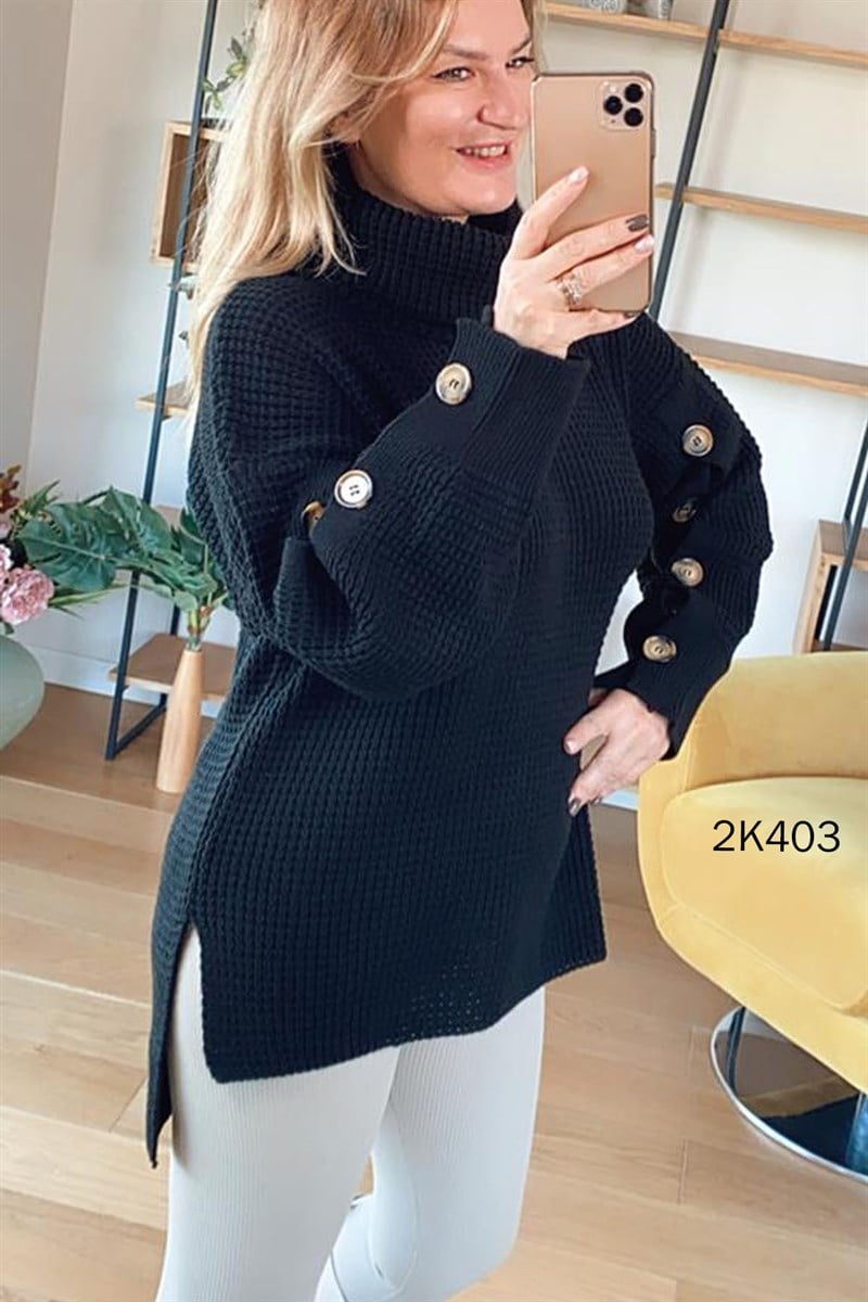 DÜĞME DETAY BOĞAZLI TRİKO BLUZ OMUZDAN AŞAĞI ÖN 68 CM ARKA 77 CM