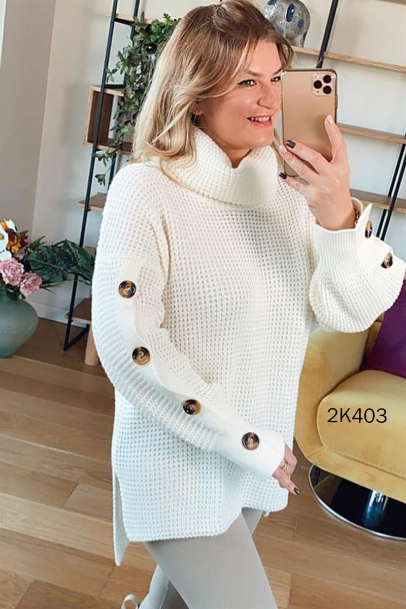 DÜĞME DETAY BOĞAZLI TRİKO BLUZ OMUZDAN AŞAĞI ÖN 68 CM ARKA 77 CM