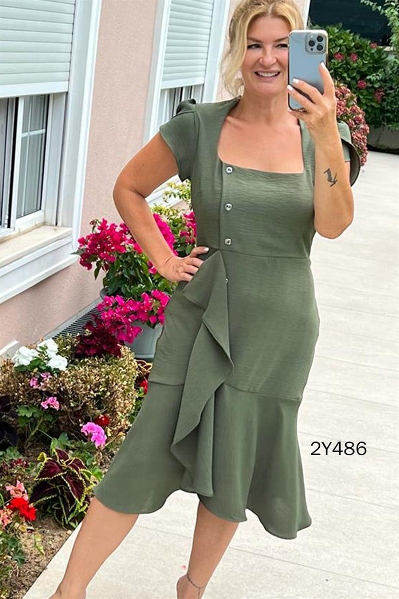 Düğme Detay Volanlı Elbise