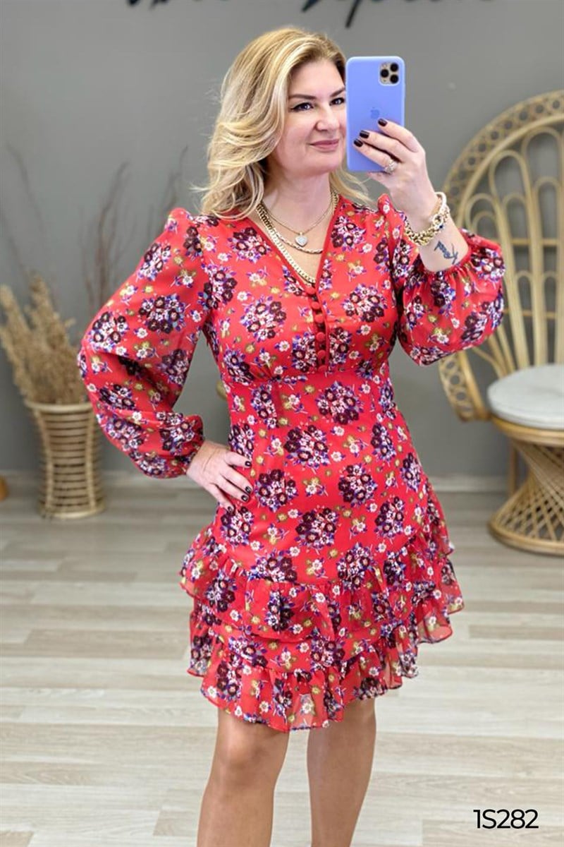 ETEĞİ FIRFIRLI DÜĞME DETAY ŞİFON ELBİSE OMUZDAN AŞAĞI 96 CM