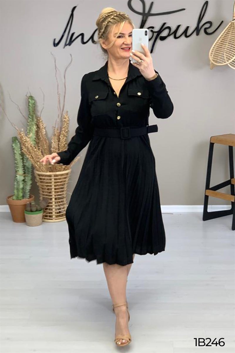 ETEĞİ PİLELİ KEMERLİ ELBİSE OMUZDAN AŞAĞI 110 CM
