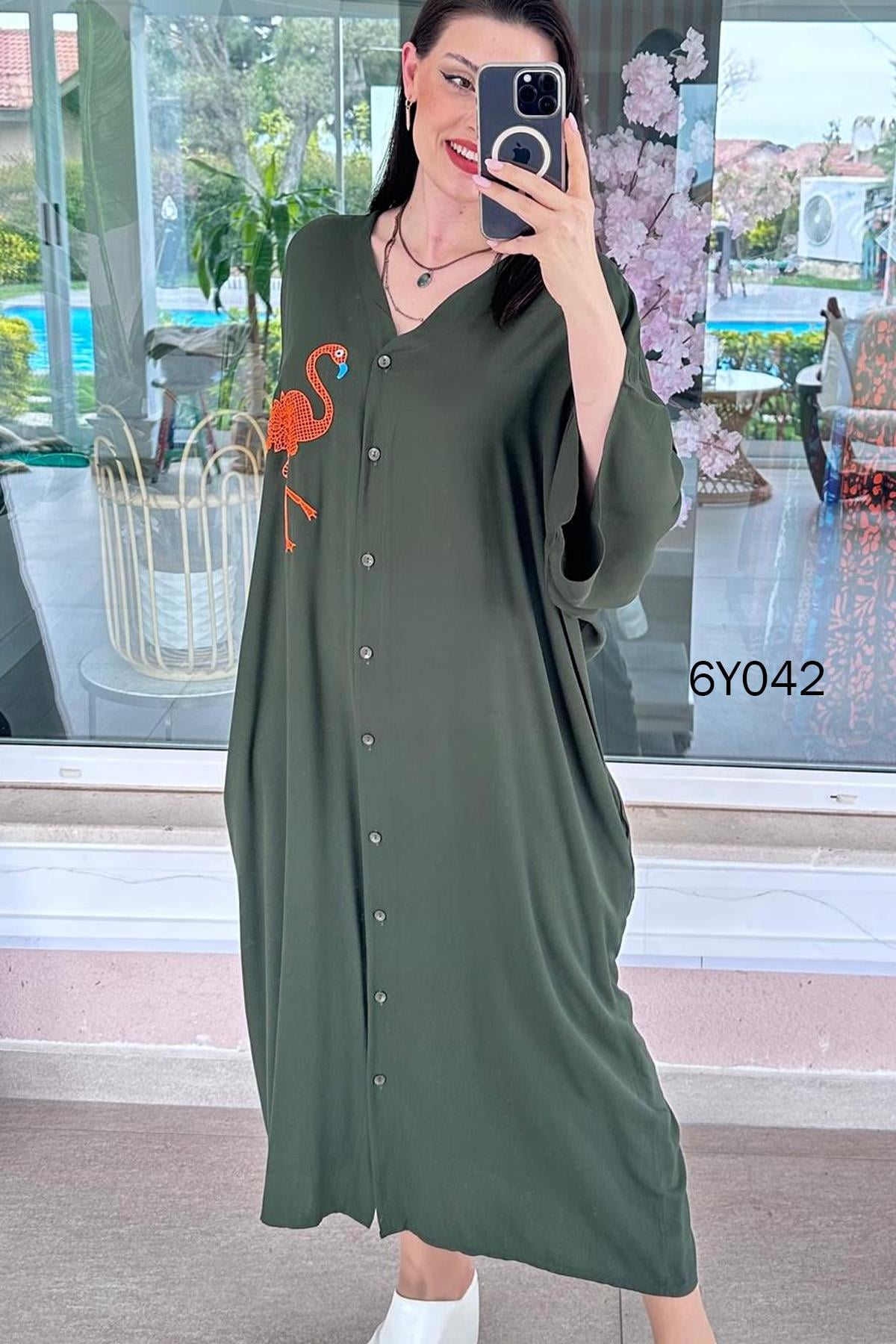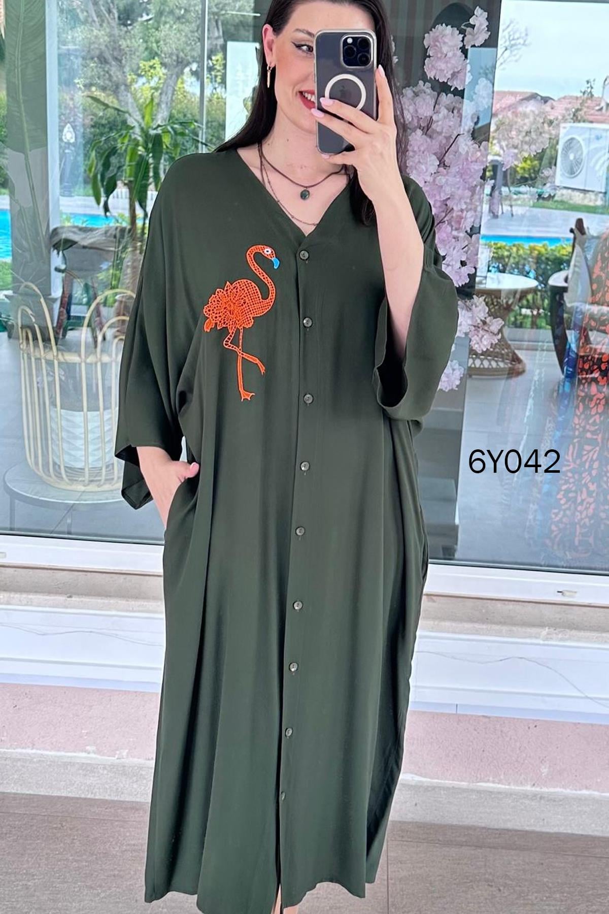 FİLAMİNGO BASKILI VİSKON ELBİSE OMUZDAN AŞAĞI 129 CM