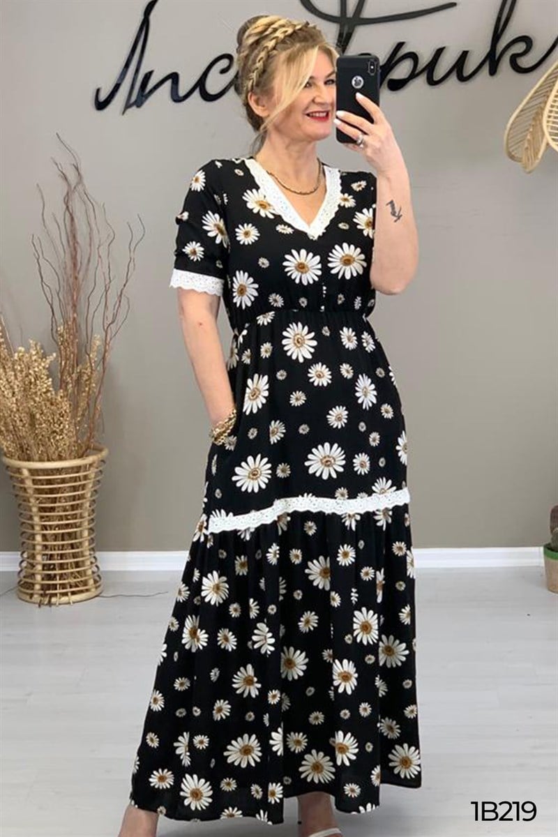 GÜPÜR DETAY BELİ LASTİKLİ ELBİSE OMUZDAN AŞAĞI 140 CM