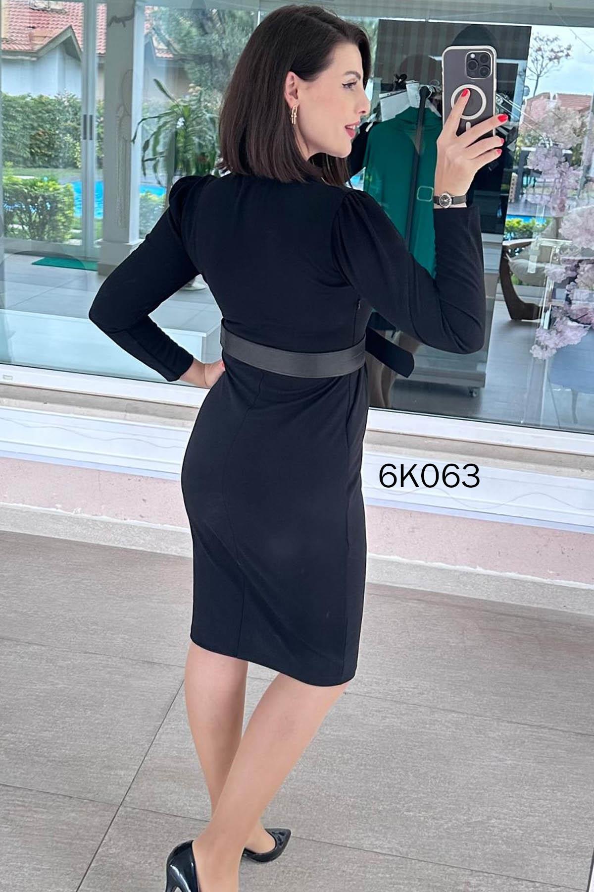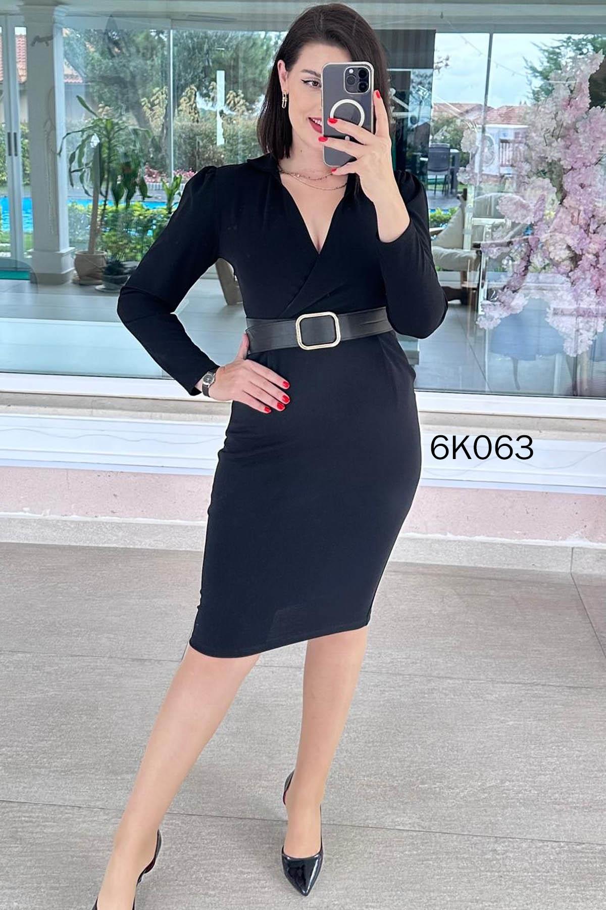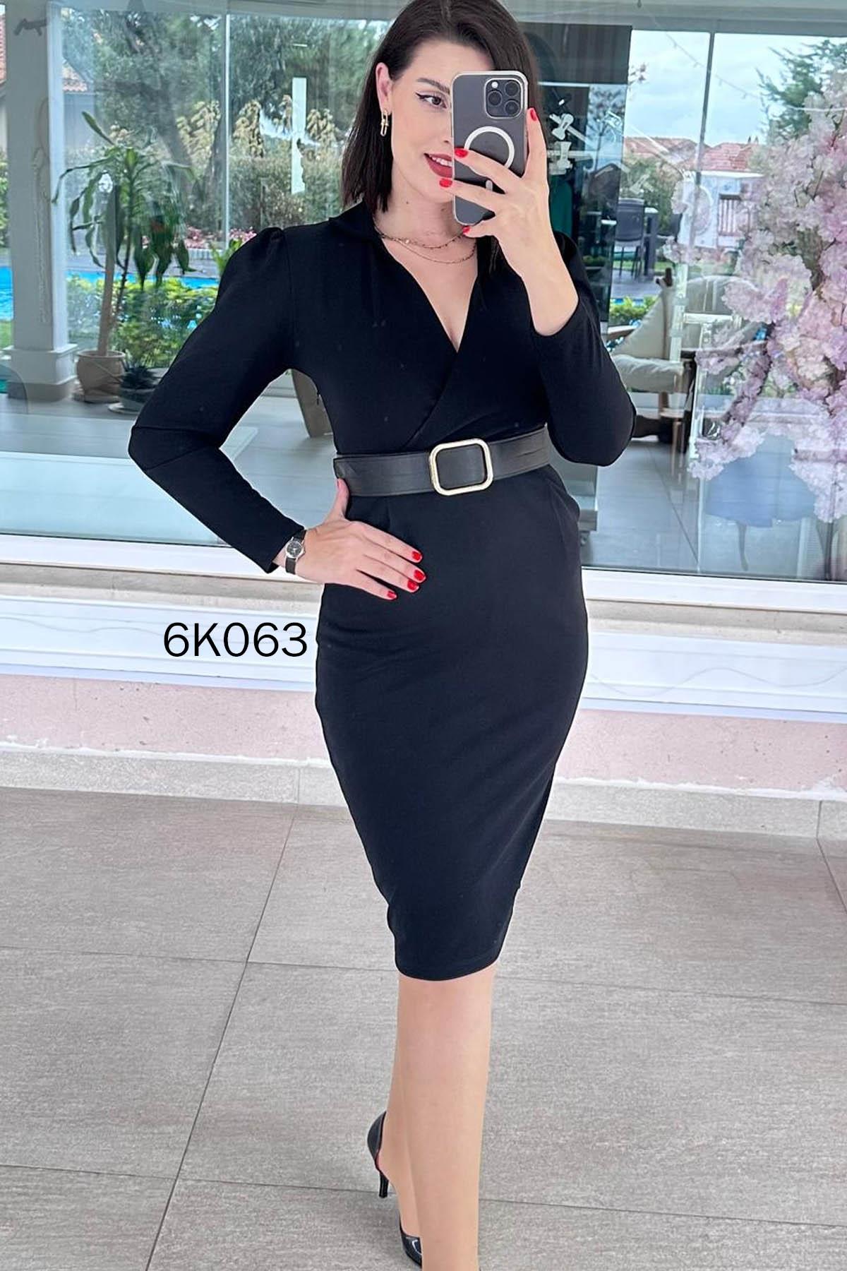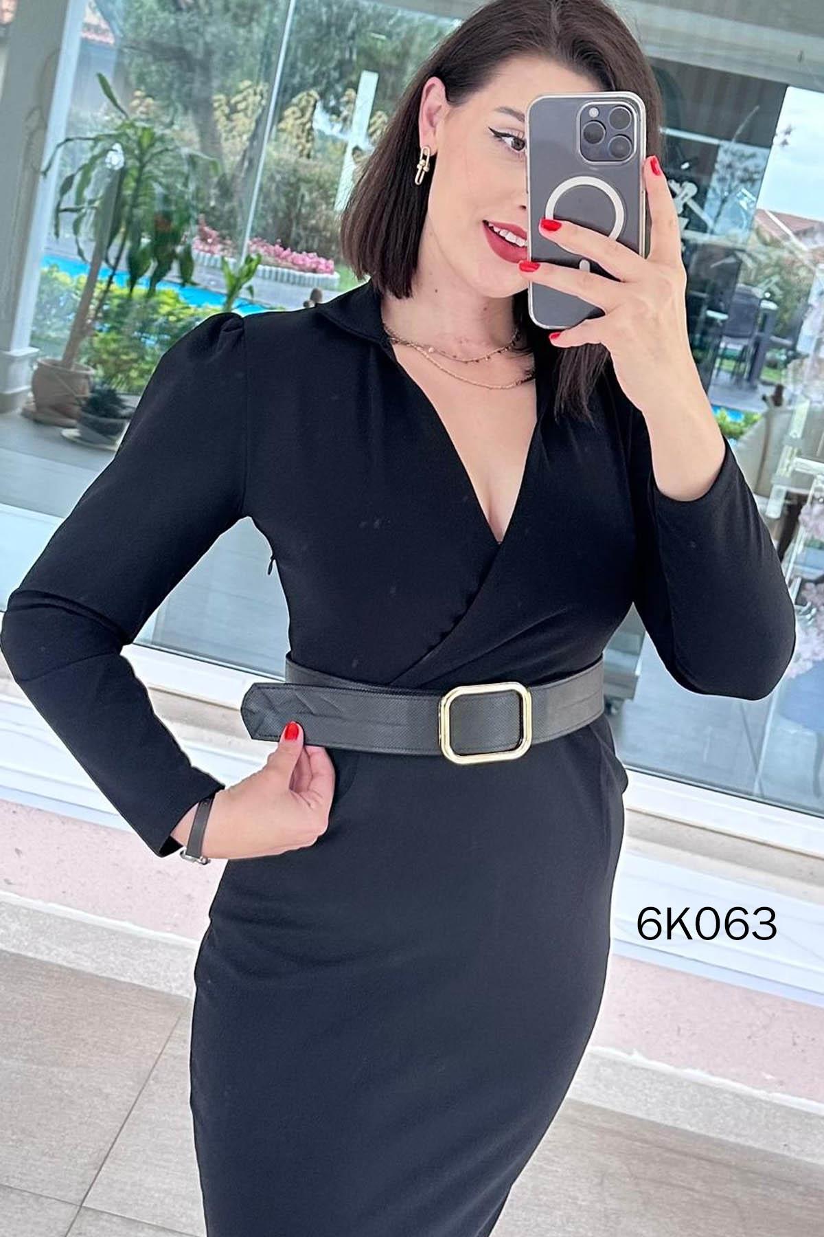 HAKİM YAKA KEMERLİ KREP ELBİSE OMUZDAN AŞAĞI 103 CM