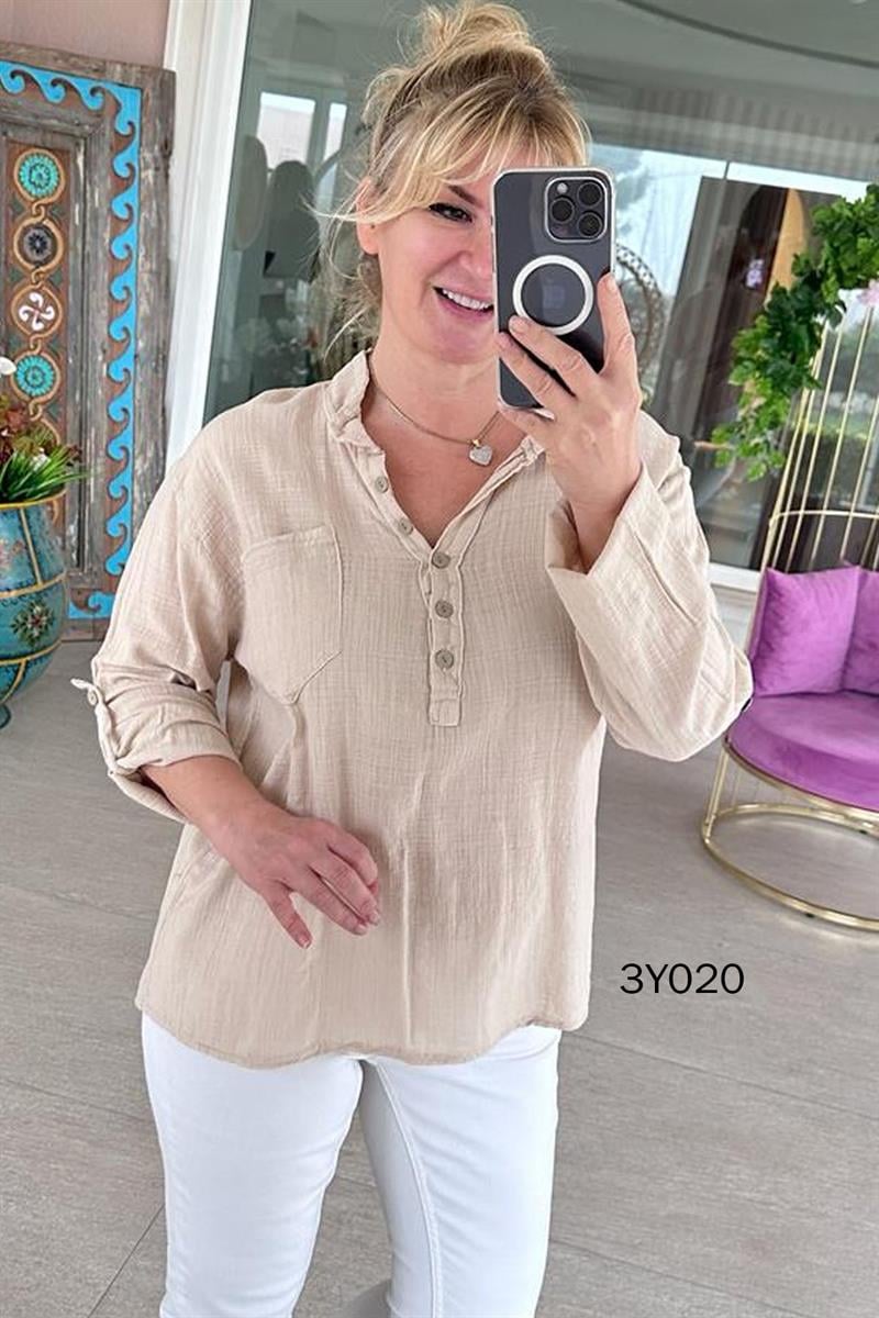 HAKİM YAKA ÖNÜ CEPLİ KETEN GÖMLEK OMUZDAN AŞAĞI ÖN 65 CM ARKA 73 CM