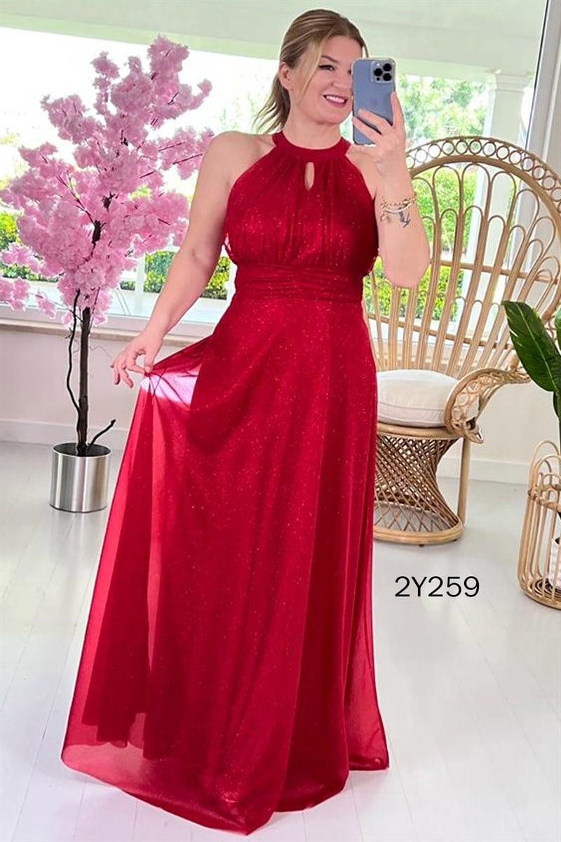 HALTER YAKA SİMLİ UZUN ELBİSE OMUZDAN AŞAĞI 160 CM