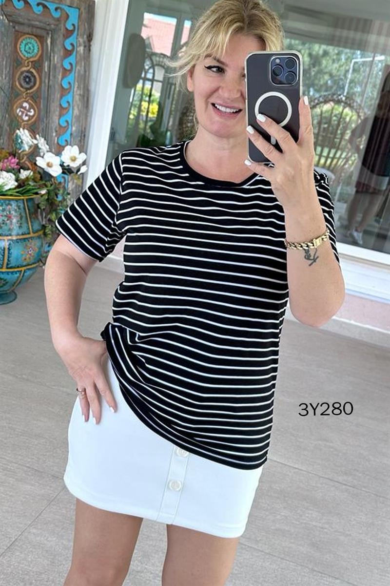 İNCE ÇİZGİLİ BİSİKLET YAKA TSHİRT OMUZDAN AŞAĞI 72 CM