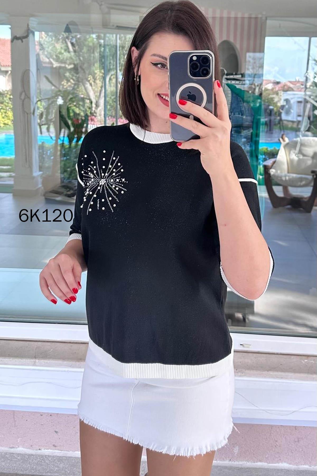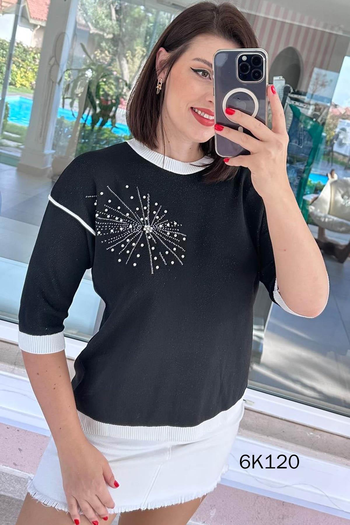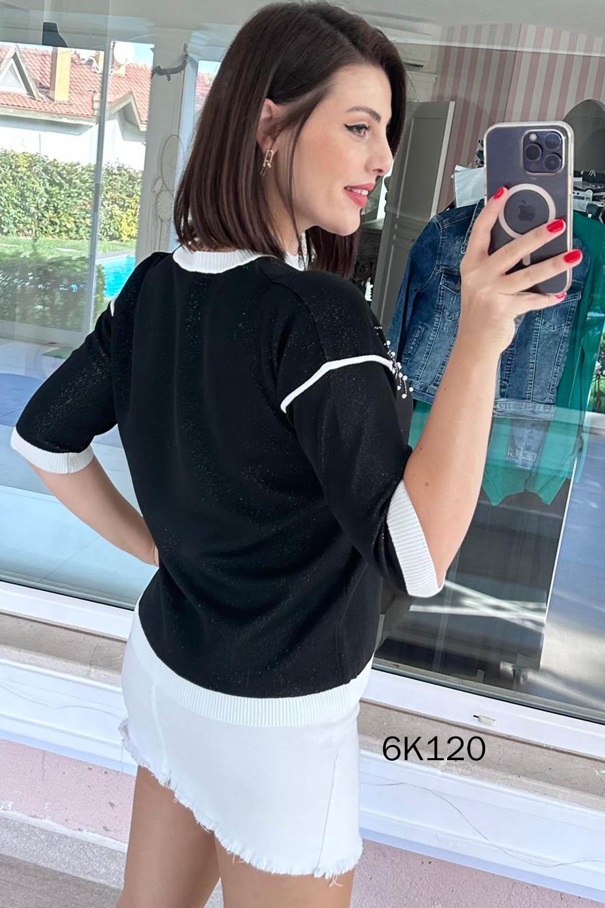 İNCİ DETAY SİMLİ TRİKO BLUZ OMUZDAN AŞAĞI 63 CM
