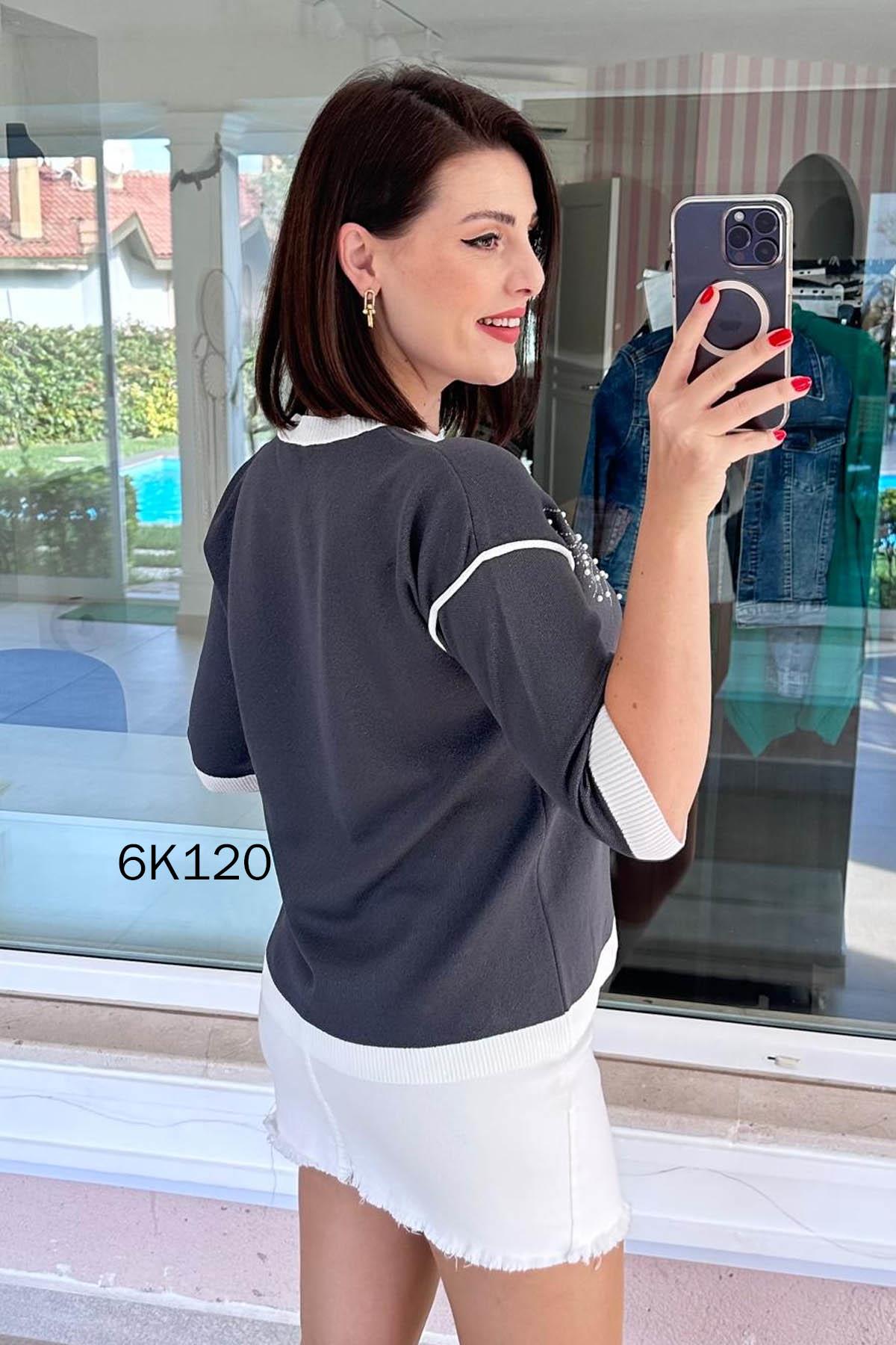 İNCİ DETAY SİMLİ TRİKO BLUZ OMUZDAN AŞAĞI 63 CM