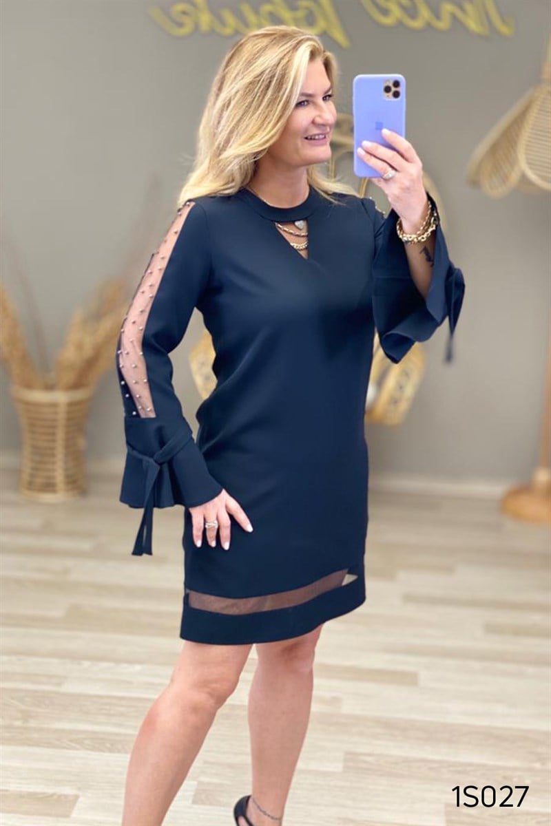BİSİKLET YAKA KOL VE ETEK UCU TÜL İNCİ DETAYLI MİDİ UZUN KOL ELBİSE
