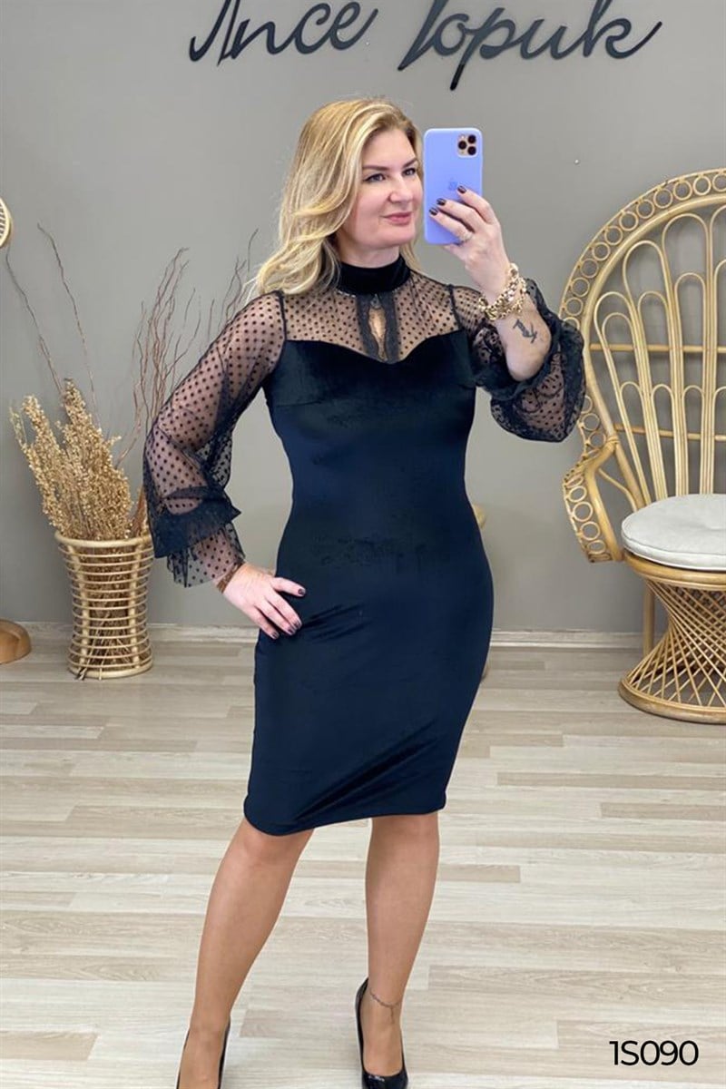 DANTEL DETAY UZUN KOLLU ARKASI FERMUARLI HAKİM YAKA MİDİ ELBİSE LİKRALI SATEN KADİFE 30C YIKAMA