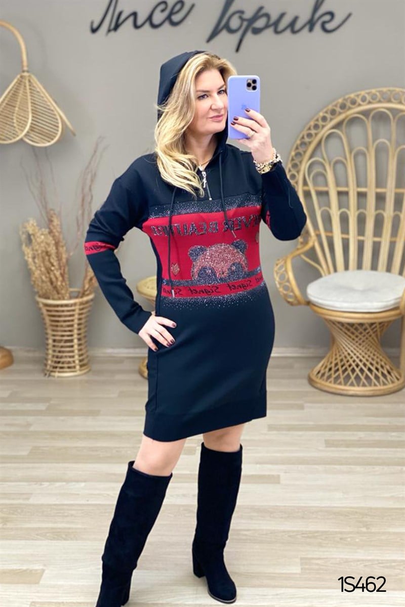 KAPŞONLU TAŞ DETAY ELBİSE OMUZDAN AŞAĞI 93 CM