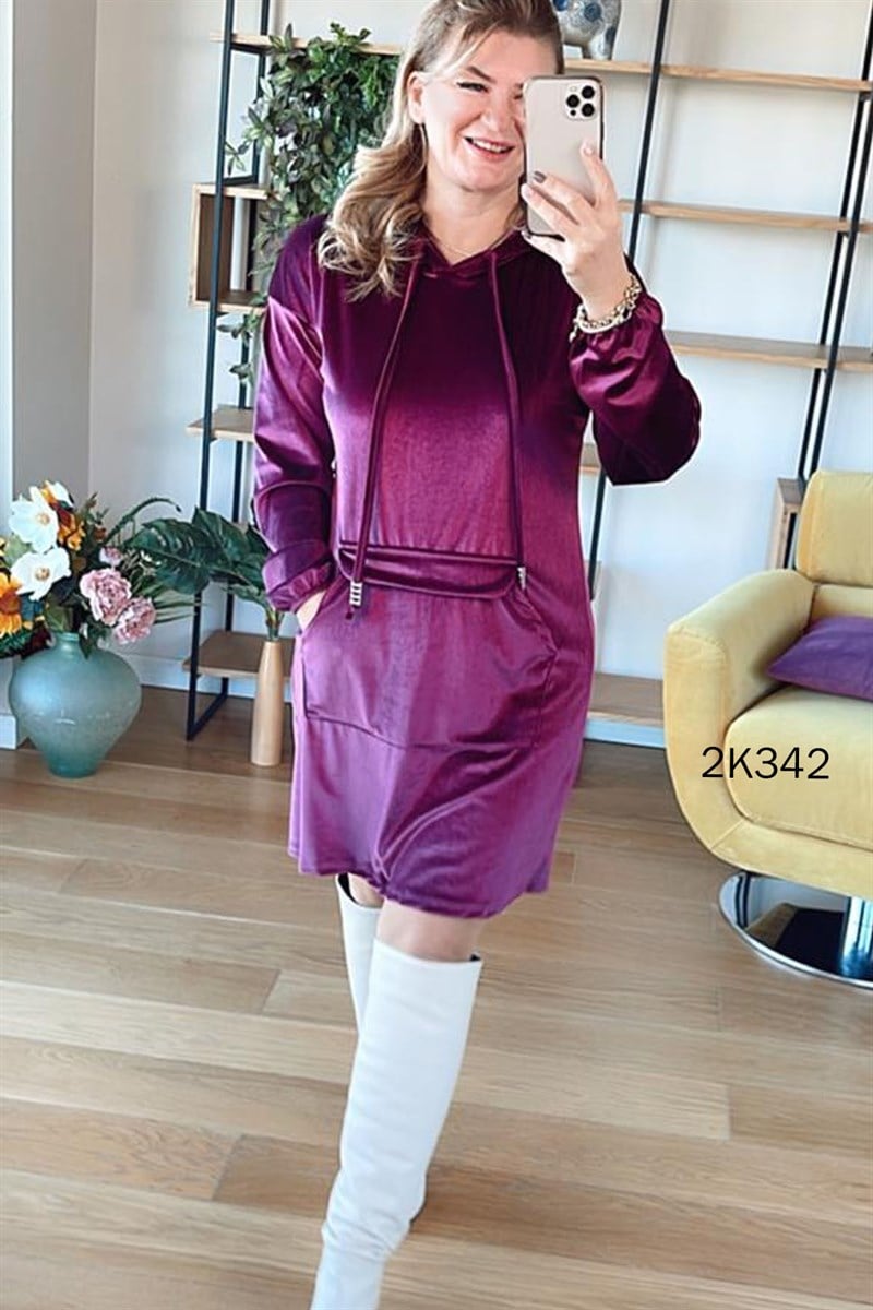 KAPŞONLU KADİFE ELBİSE OMUZDAN AŞAĞI 90 CM