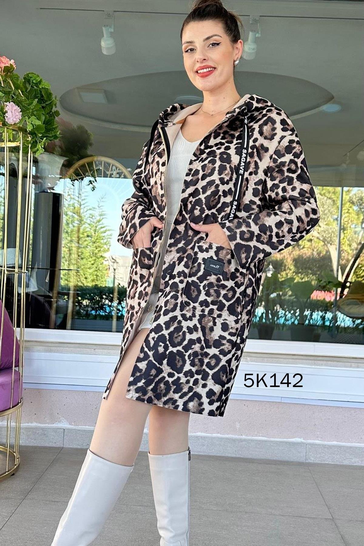 KAPŞONLU LEOPAR DESENLİ CEKET OMUZDAN AŞAĞI 95 CM