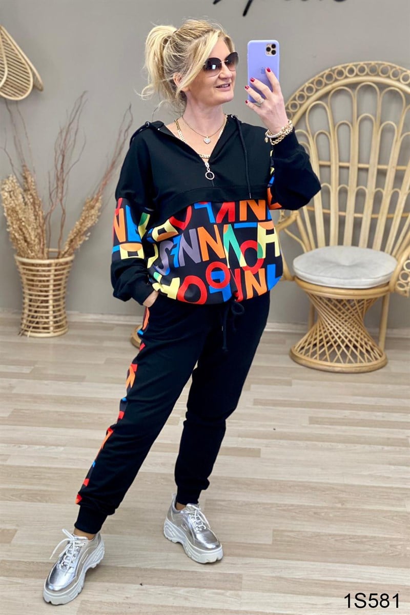 KAPŞONLU YAZI BASKILI EŞOFMAN TAKIMI ÜST OMUZDAN AŞAĞI 70 CM ALT BELDEN AŞAĞI 100 CM