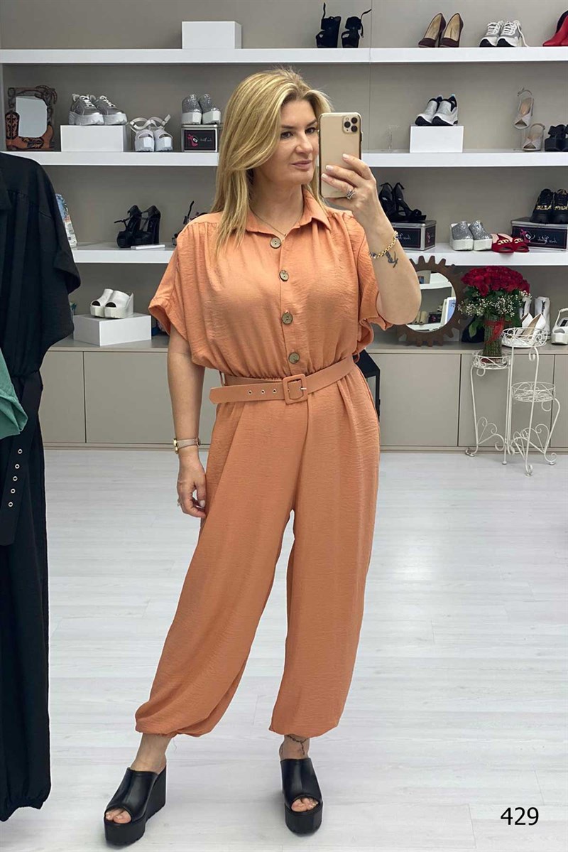 KISA KOLLU GÖMLEK YAKA ÖNÜ DÜĞMELİ KEMERLİ BELİ LASTİKLİ TULUM
