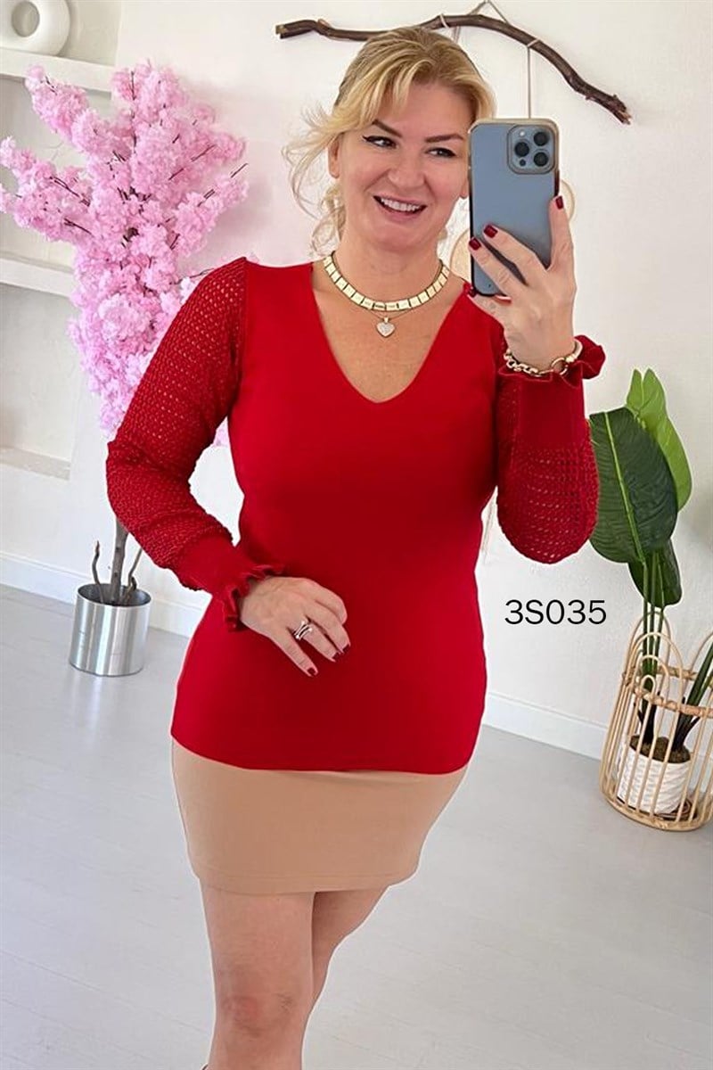 KOLLARI AJURLU TRİKO BLUZ OMUZDAN AŞAĞI 67 CM