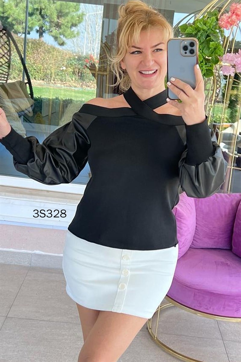 KOLLARI DERİ DETAY OMUZ DEKOLTE TRİKO BLUZ OMUZDAN AŞAĞI 50 CM