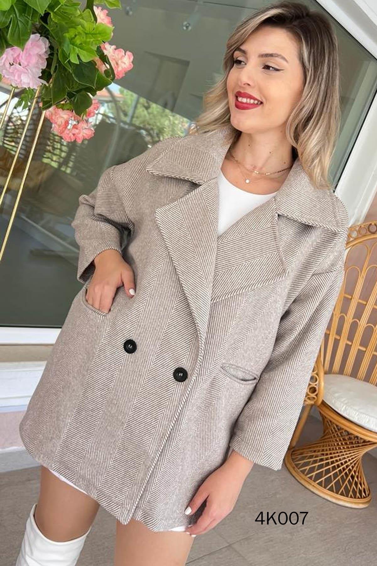 KRUVAZE DÜĞMELİ KAŞE KABAN OMUZDAN AŞAĞI 75 CM Ürünümüz rahat kalıptır.