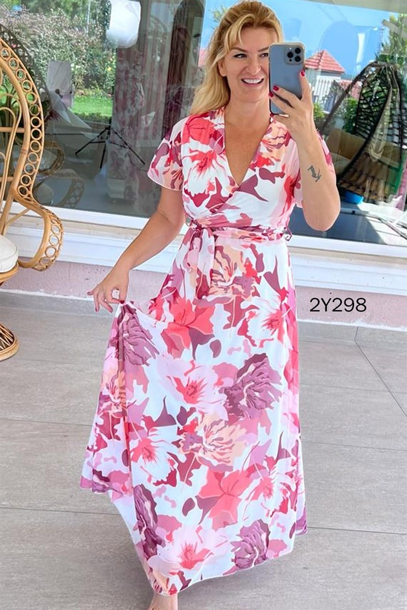 Kruvaze Yaka Belden Bağlamalı Şifon Elbise