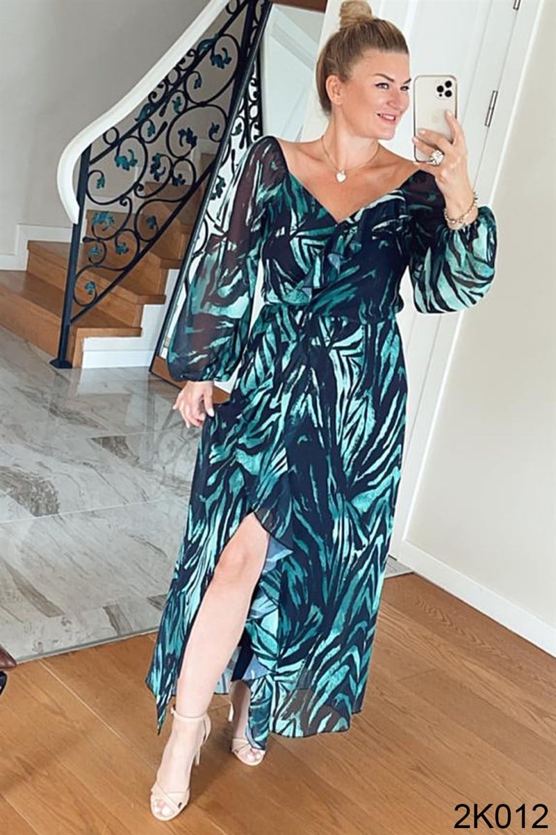 Kruvaze Yaka Beli Lastikli Şifon Elbise