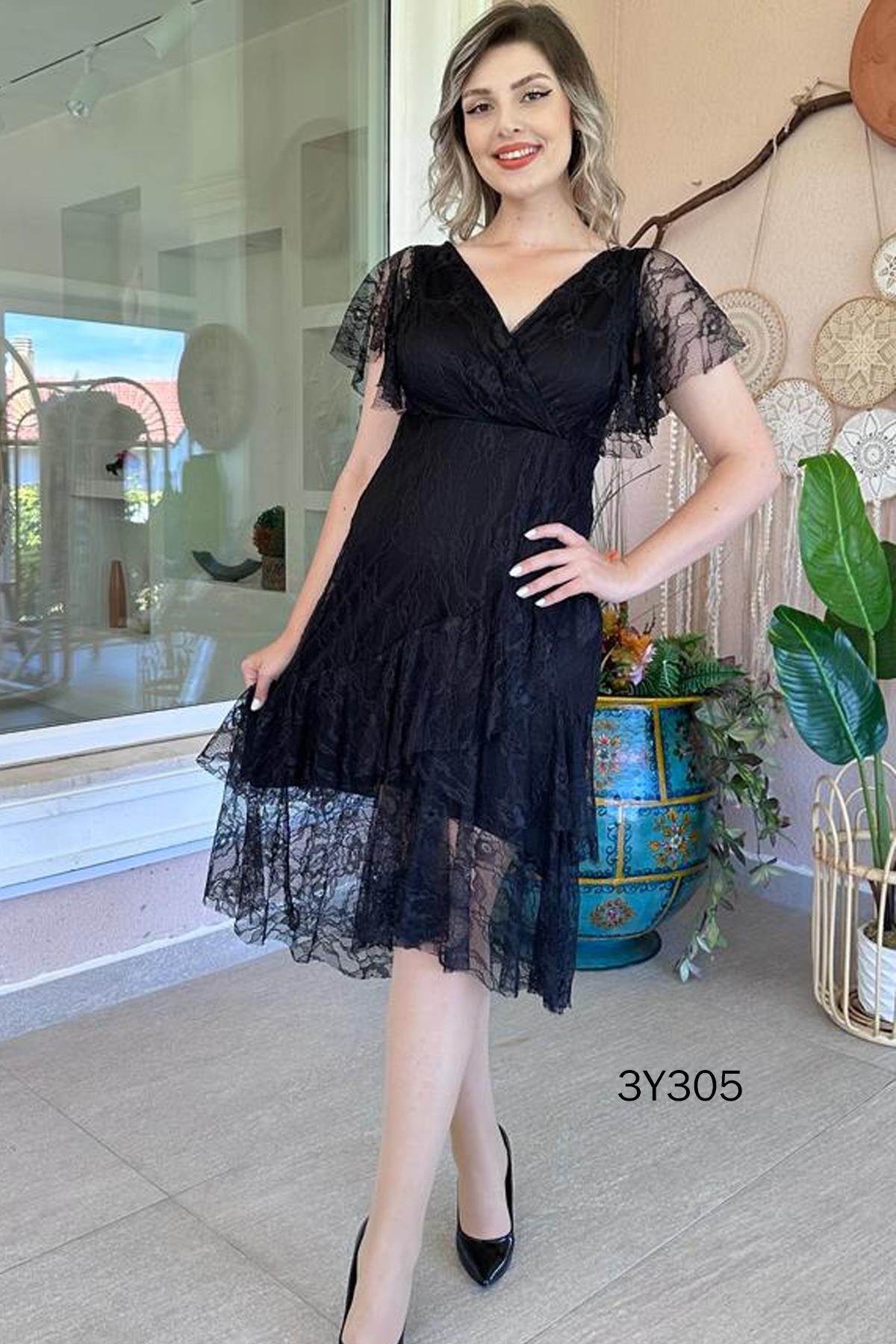 KRUVAZE YAKA DANTEL ELBİSE OMUZDAN AŞAĞI ÖN 102 ARKA 105 CM