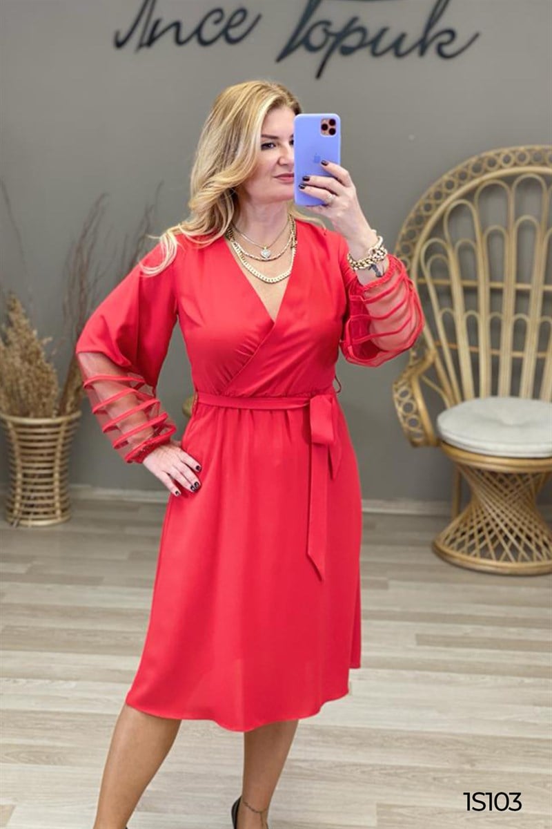 KRUVAZE YAKA KOL TÜL DETAYLI KOL UCU LASTİKLİ BELİ LASTİKLİ VE BAĞLAMALI UZUN KOL ELBİSE