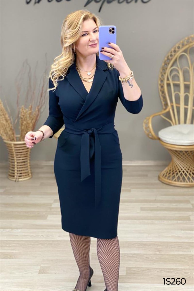 KRUVAZE YAKA BELDEN BAĞLAMALI ÖNDEN CEPLİ ELBİSE OMUZDAN AŞAĞI 100CM