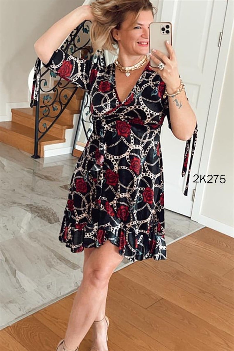 Kruvaze Yaka Fırfır Detay Kadife Elbise