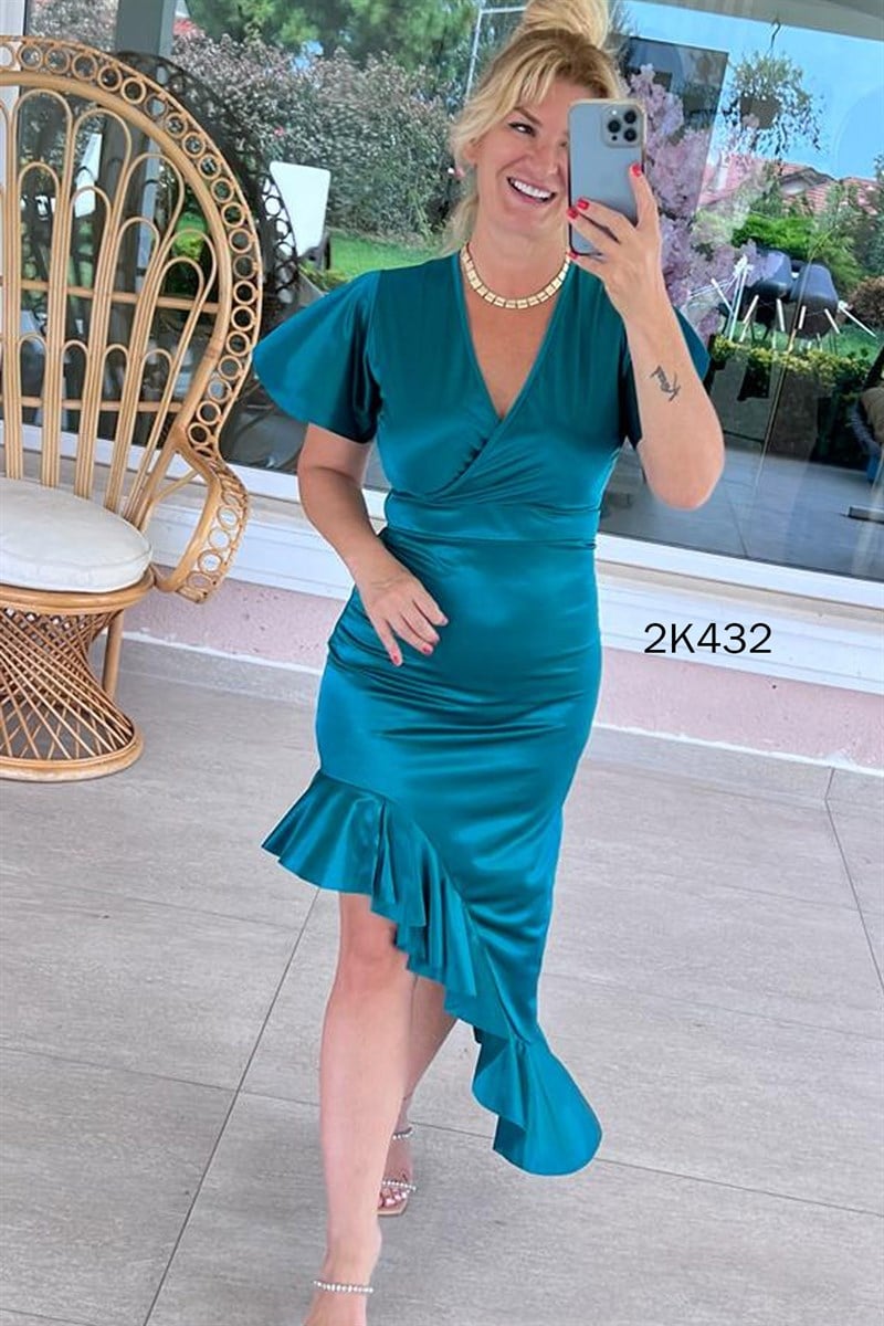 Kruvaze Yaka Fırfır Detay Saten Elbise